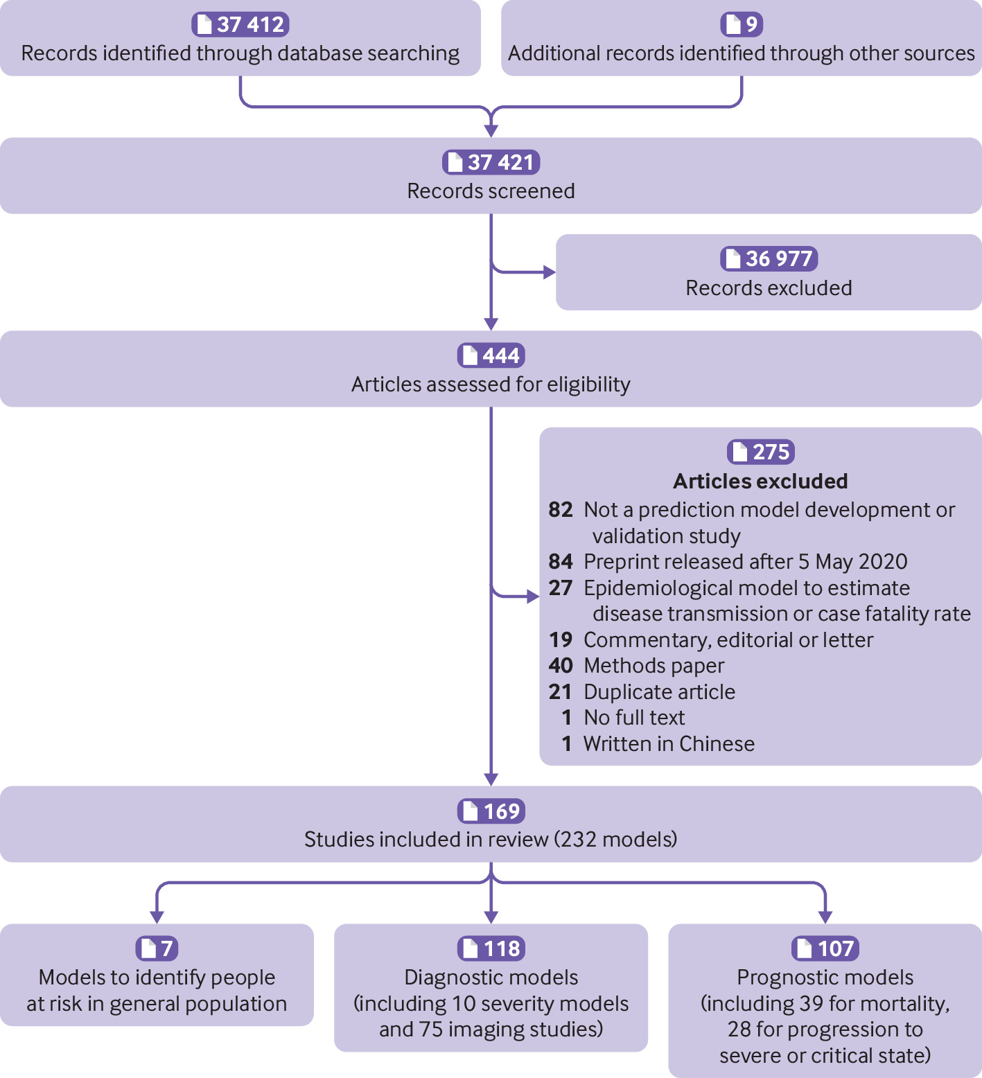We retrieved 37 412 titles through our systematic search (of which 23 203 were included in the present update; supplementary table 1, fig 1). We included a further nine studies that were publicly available but were not detected by our search. Of 37 421 titles, 444 studies were retained for abstract and full text screening (of which 169 are included in the present update). One hundred sixty nine studies describing 232 prediction models met the inclusion criteria (of which 62 studies and 87 models added since the present update, supplementary table 1).15 16 17 18 19 20 21 22 23 24 25 26 27 28 29 30 31 32 33 34 35 36 37 38 39 40 41 42 43 44 45 46 47 48 49 50 51 52 53 54 55 56 57 58 59 60 61 62 63 64 65 66 67 68 69 70 71 72 73 74 75 76 77 78 79 80 81 82 83 84 85 86 87 88 89 90 91 92 93 94 95 96 97 98 99 100 101 102 103 104 105 106 107 108 109 110 111 112 113 114 115 116 117 118 119 120 121 122 123 124 125 126 127 128 129 130 131 132 133 134 135 136 137 138 139 140 141 142 143 144 145 146 147 148 149 150 151 152 153 154 155 156 157 158 159 160 161 162 163 164 165 166 167 168 169 170 171 172 173 174 175 176 177 178 179 180 181 182 183 These studies were selected for data extraction and critical appraisal. The unit of analysis was the model within a study: of these 232 models, 208 were unique, newly developed models for covid-19. The remaining 24 analyses were external validations of existing models (in a study other than the model development study). Some models were validated more than once (in different studies, as described below). Many models are publicly available (box 1). A database with the description of each model and its risk of bias assessment can be found on https://www.covprecise.org/.